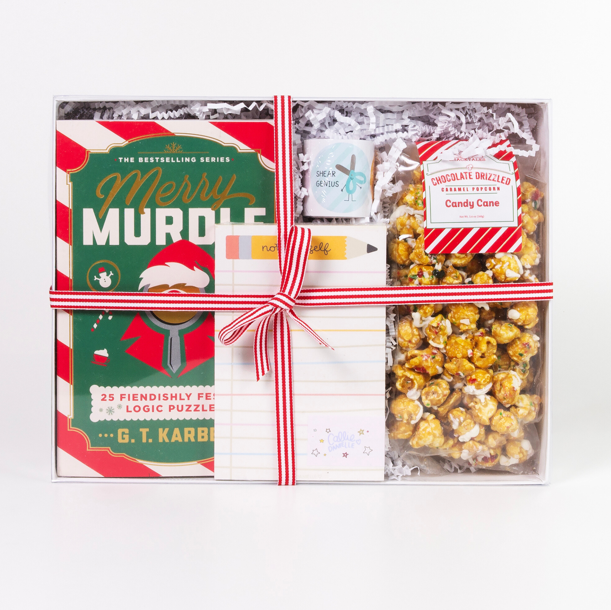 Perfect for the teacher who loves a clever challenge, this festive gift set features Merry Murders, a holiday-themed logic puzzle book packed with fun, fiendishly festive mysteries. Complemented by a roll of cleaver grading stickers, a notepad for quick notes or plans, and a generous serving of candy-cane-drizzled caramel popcorn, it’s the ideal bundle for relaxing over winter break. Thoughtfully packed in a clear box and tied with a classic striped ribbon, this gift delivers a blend of brain-teasing entertainment, sweetness, and seasonal spirit.