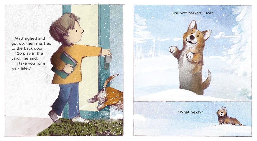 Snow! Snow! And more snow! Oscar was itching to go outside, but the house was as quiet as a sleeping puppy. No one was awake, not even his boy Matt. When Oscar finally gets out to play, he can’t resist the chance to run away and pursue his how own wintry escapades. He builds an igloo, he makes a doggy angel, and he even goes ice skating—all with the help of his new friend Daisy. But the best part of this snow day comes when Oscar’s boy and Daisy’s girl join them for a cozy igloo huddle.