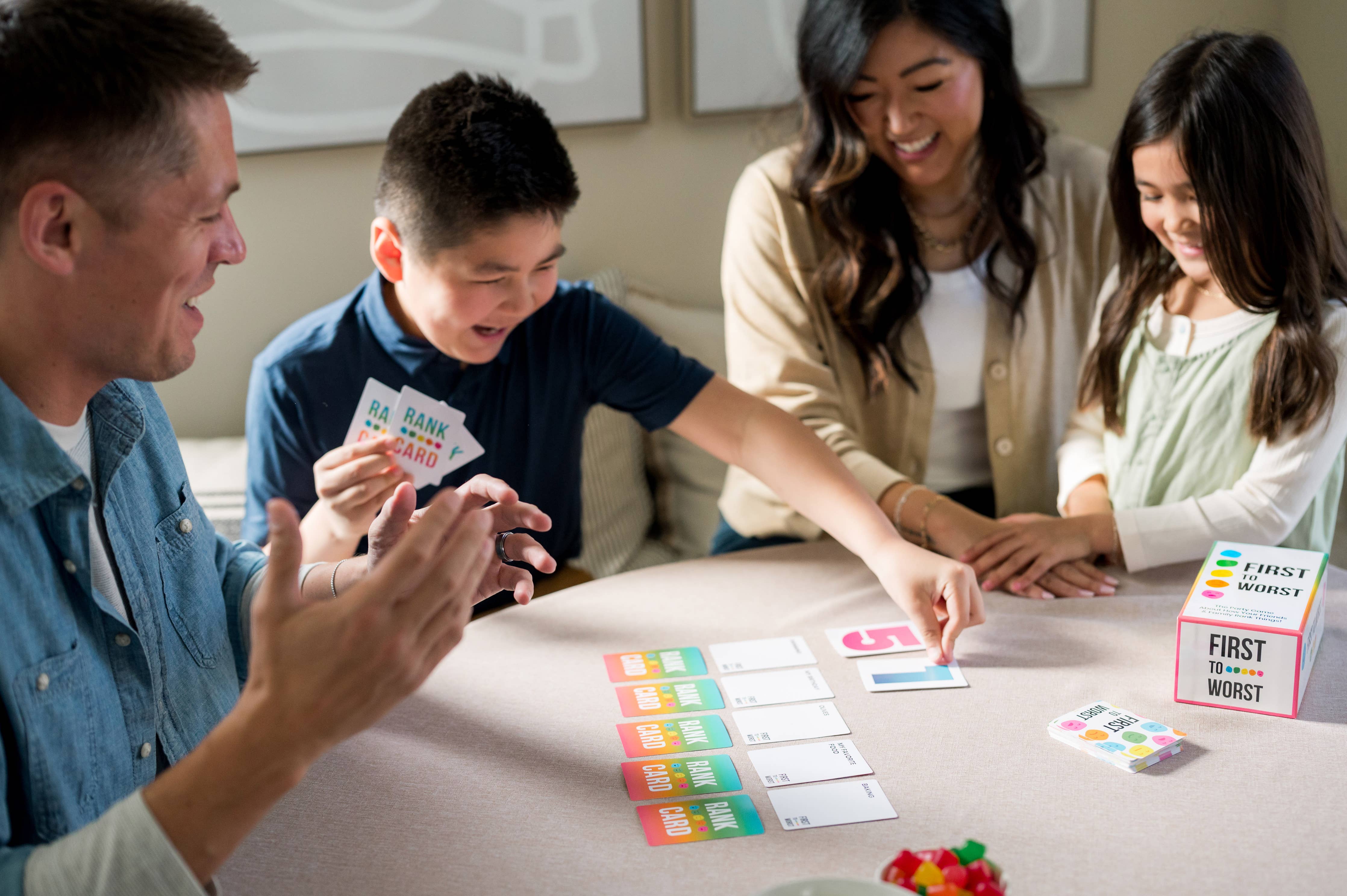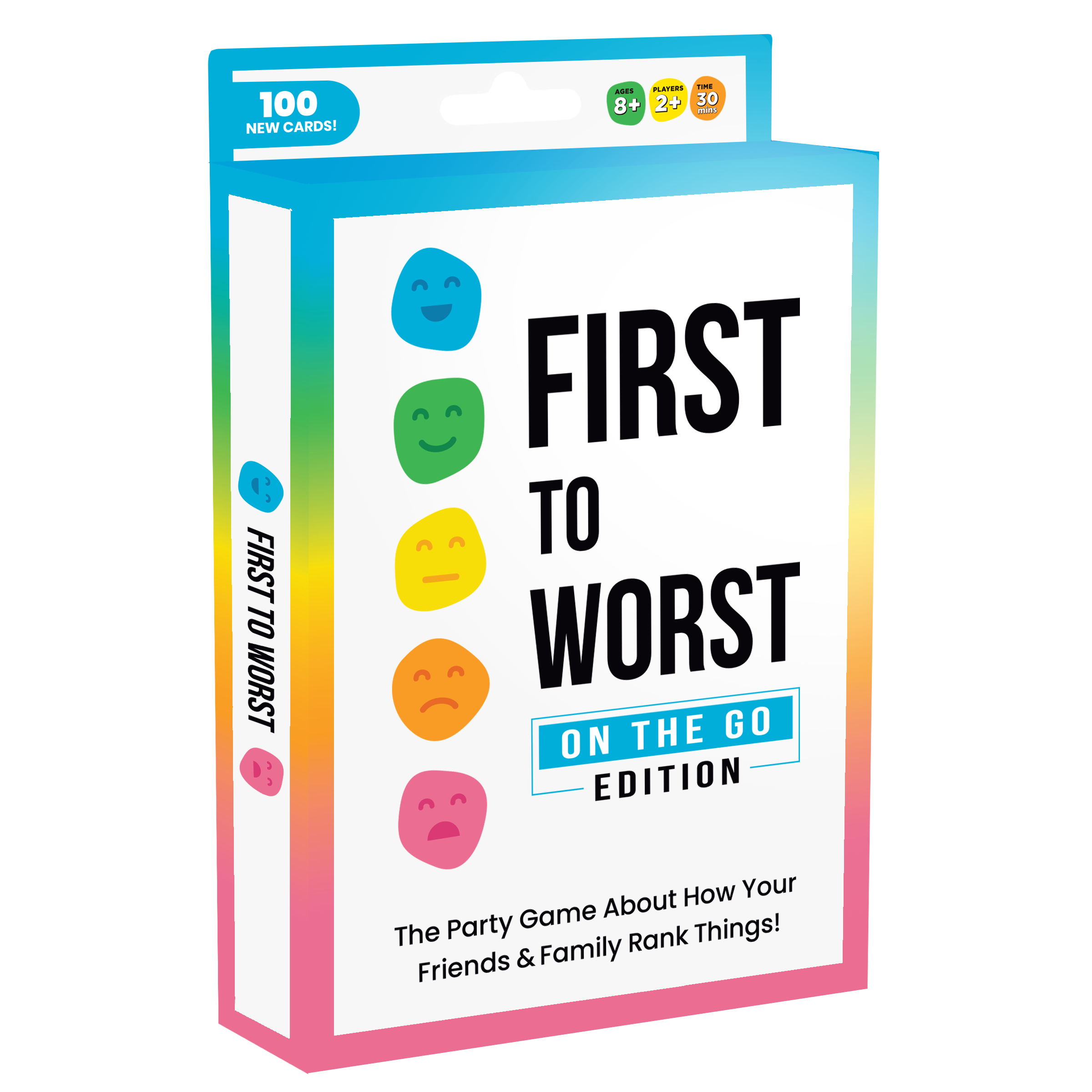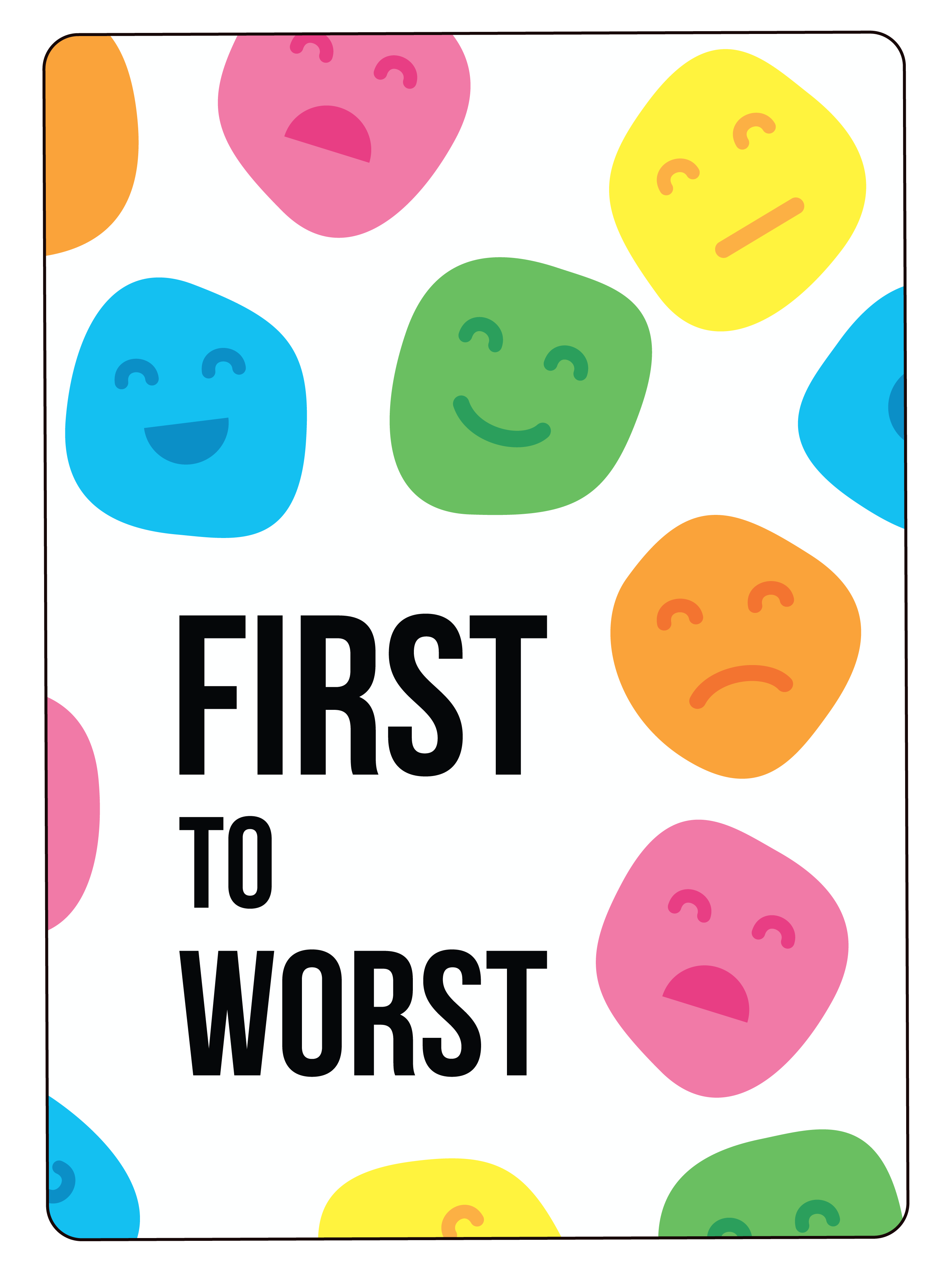 FIRST TO WORST is a hilarious card game that turns ranking quirky topics into unforgettable fun for the whole family. From pineapple on pizza to cat videos, players try to guess how one person (THE RANKER) ordered five topics from best to worst. Work as a team to guess the correct order and win! This collaborative game sparks laughs, debates, and surprising discoveries as you try to get inside each other’s heads. With nearly 300 topics and over 400 cards, it's endlessly re-playable and perfect for all ages, grandma, teens, siblings, aunts, and everyone in between.